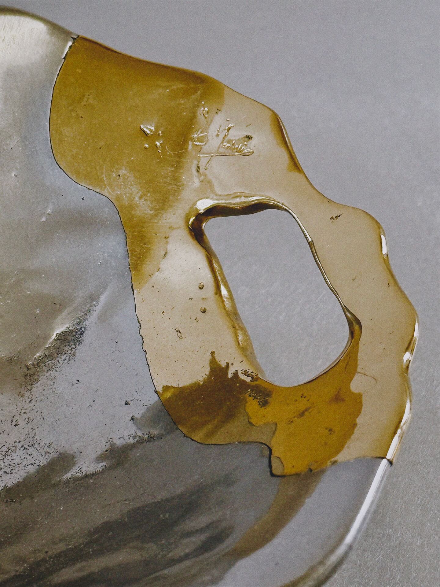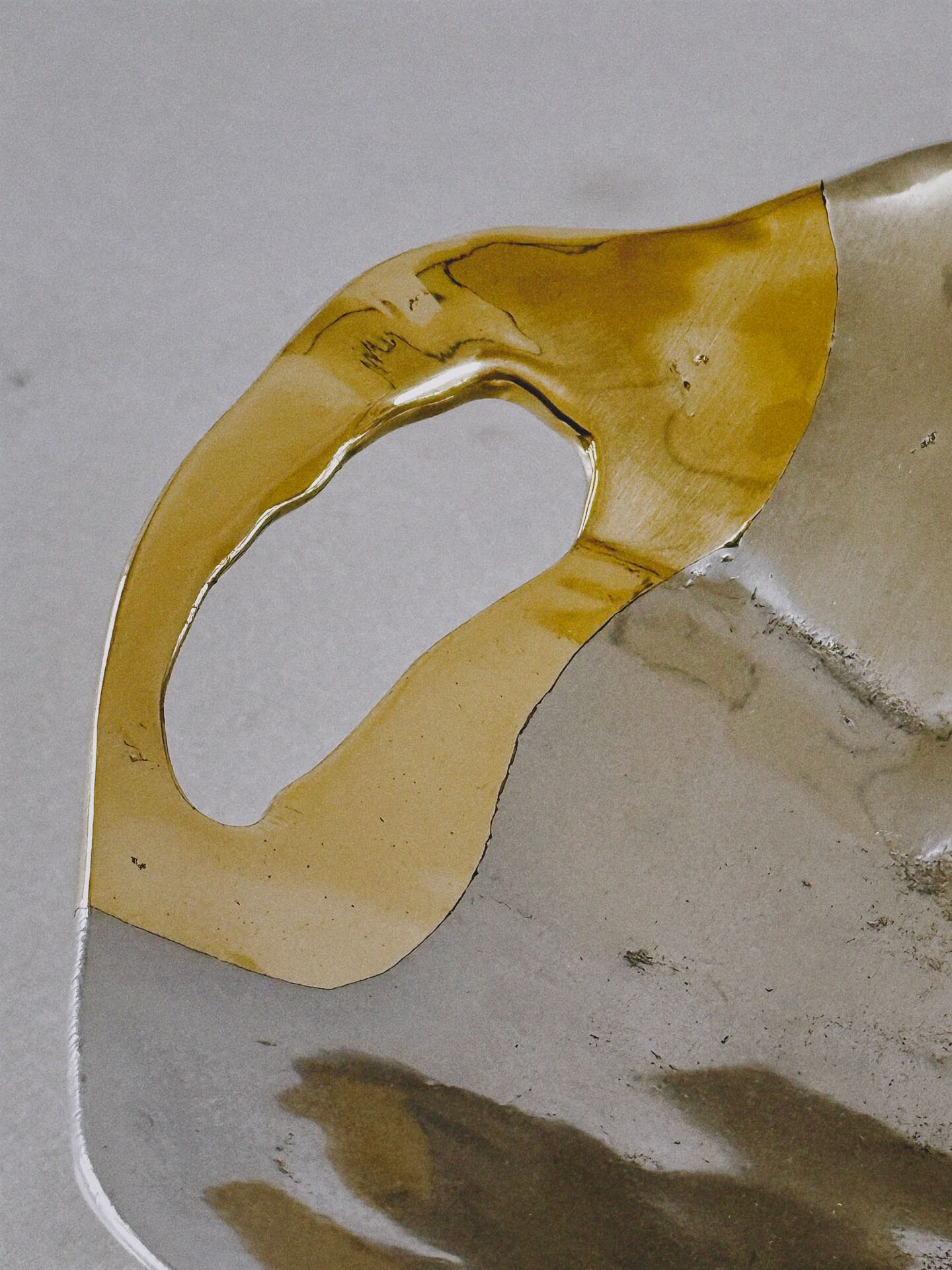 Twin Handled brutalist bowl by David Marshall, hand-cast in aluminium and brass. Produced in Spain during the 1980s and signed by the artist. Each piece is individually cast, giving a distinct surface character and form.
