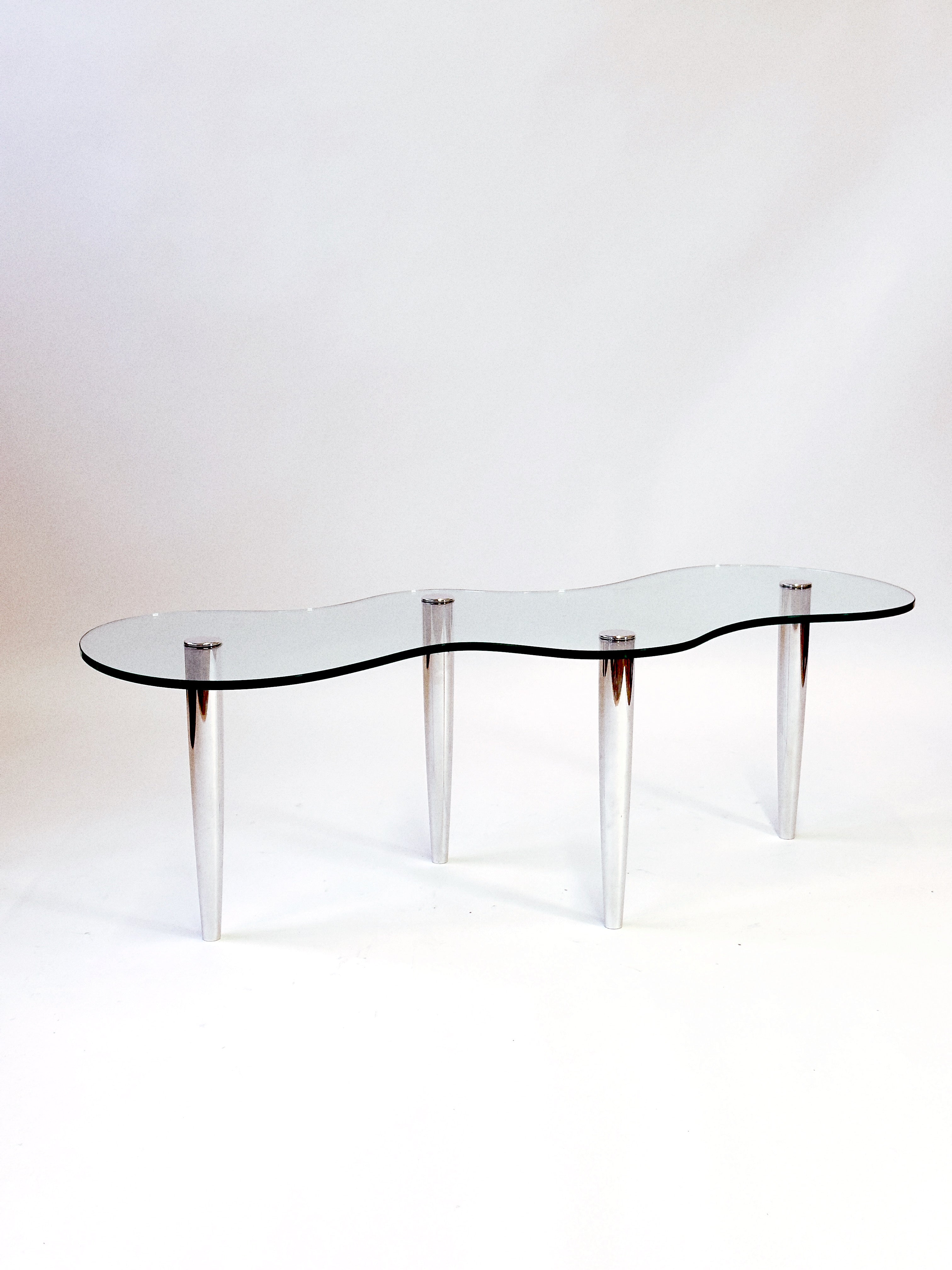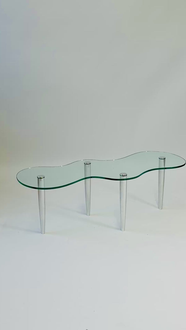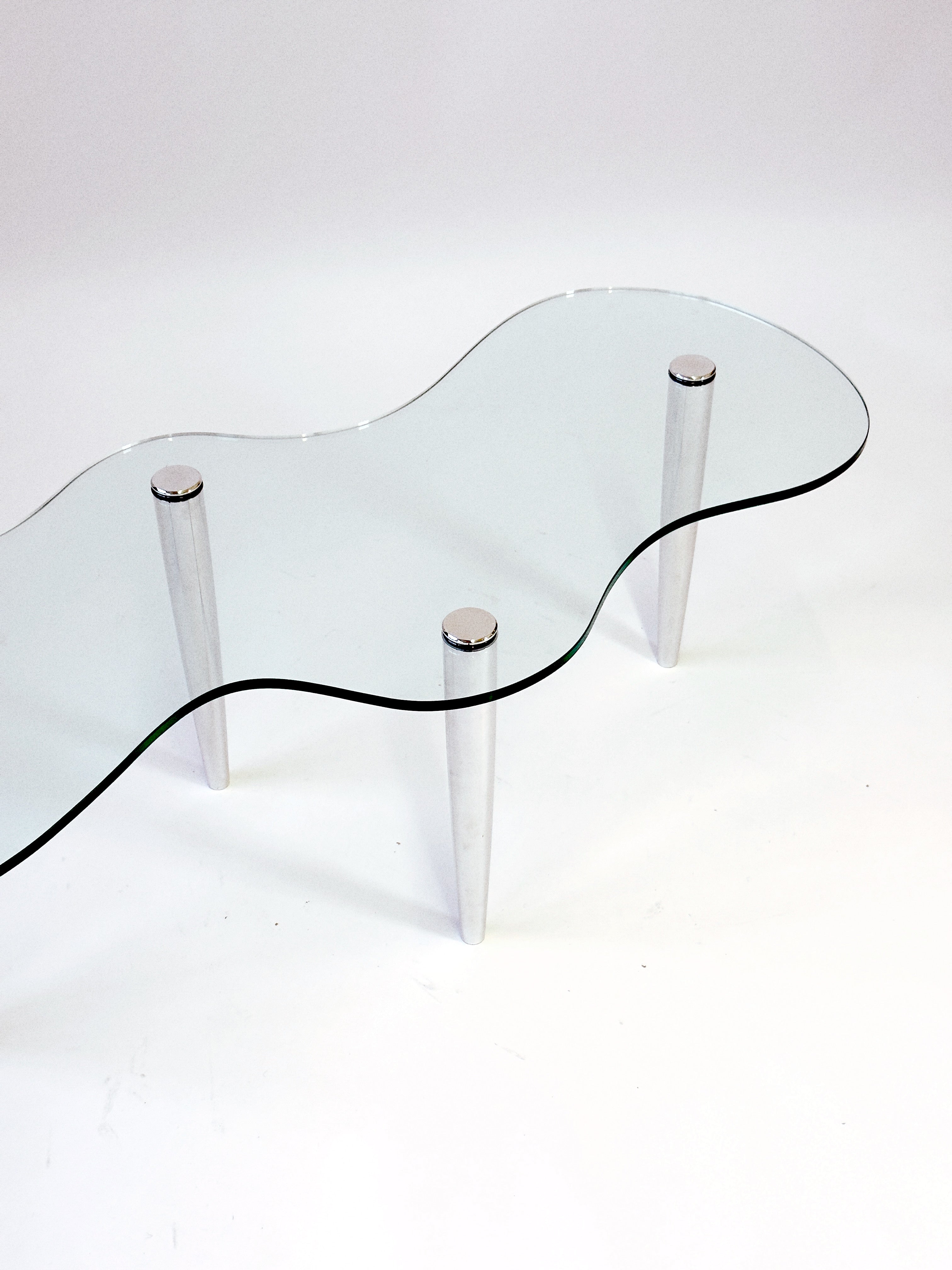 Super Ornament, custom made wavy glass coffee table with repurposed cast aluminium legs.
